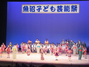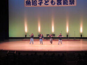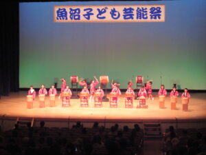 先日、「魚沼子ども芸能祭」に参加しました。堀之内地区の小・中学校合同で「大の阪」を踊りました。そして、宇賀地小の3・4年生は「天神囃子」と和太鼓の発表を行いました。また、ダンスクラブの4名がダンスを披露しました。