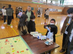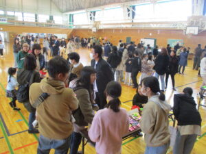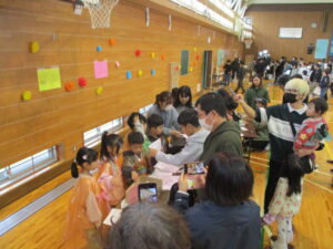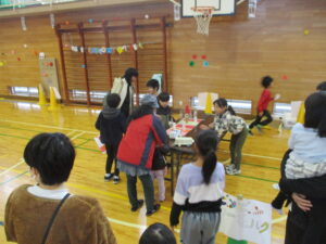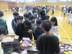 お神おくりは雨のため、体育館での出店となりました。6年生は「的あて」「ストラックアウト」「射的」「ぴったりストップウオッチ」「箱の中身はなんだろな」、2年生は「おもちゃランド」、1年生は「ほりのうちパワークイズ」の各コーナーを運営しました。どのコーナーも子どもたちが工夫を凝らして準備しました。家の方や地域の方がたくさん来てくださって、とても盛り上がりました。