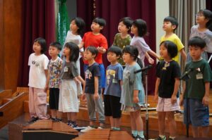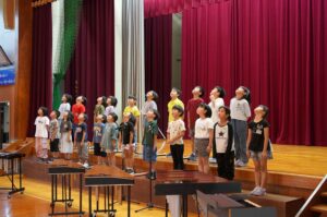 今日の朝、音楽朝会があり、1・2年生が発表をしました。歌は「青い空に絵をかこう」、合奏は「アイアイ」でした。