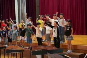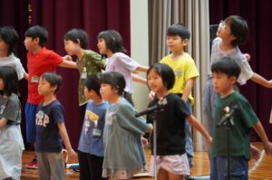 歌では、一人一人が体を使いながらリズムをとり、体育館いっぱいに声を響かせ、楽しそうに歌うことができました。