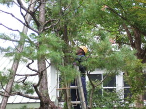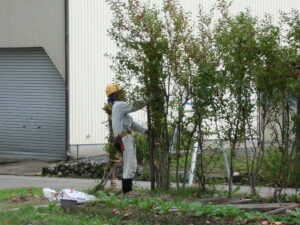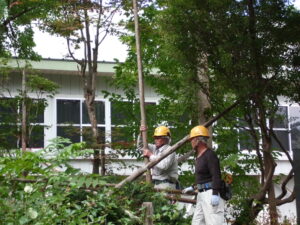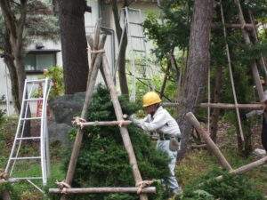 昨日(10月20日)、シルバー人材センターの方にお越しいただき、学校の前庭の草木や樹木、記念碑などの冬囲いをしていただきました。雪による損傷を防ぐ大切な作業です。