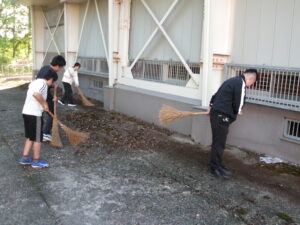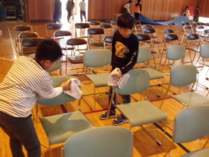 子どもたちは、先生の指示をよく聞き、安全に気を配りながら、机やパイプ椅子を所定の場所まで運んだり、床をモップや雑巾でふいたりしました。さすが上学年です。みんなてきぱきと行動していて、見ていてとても気持ちがいいです。張り切って会場設営に取り組む姿から、明日の発表への意欲の高まりを感じました。