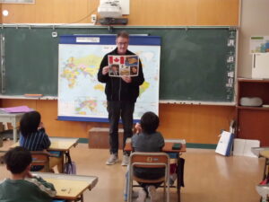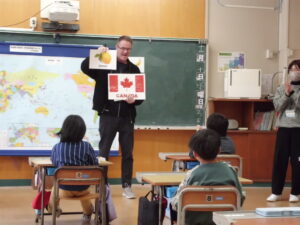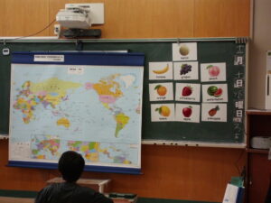 最初は、ロバート先生の自己紹介を兼ね、母国カナダについて、英語と日本語を交えながら説明していただきました。その後、カナダに関連させた〇×クイズや、いくつかのヒントからフルーツ(リンゴやバナナ)を当てるクイズなどを行いました。二人の先生から発せられる言葉は、ほとんどが英語でしたが、子どもたちは、全く分からないわけでなく、ところどころに聞き覚えのある単語が出てくることで、興味を示し、積極的に英語で質問に答えたり、先生の発音を手本にしながら繰り返し英語で発音したりしました。