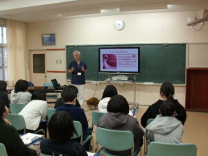 がんは年々増加傾向にあり、今や、「二人に一人ががんに罹る」と言われています。そのリスクを少しでも減らすためには、小さい頃からがんについて正しい知識をもち、がんに罹りにくい生活習慣を身に付けることが大切です。今日は、主に「がん発生のメカニズム」や「がんのリスクを高めてしまう要因」、「がんの早期発見の大切さ」等について、研修医の幸坂先生と小出病院長の鈴木先生からお話を聞きました。