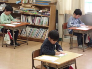 おしゃべりする人は一人もいません。練習してきたからこそ、こだわりがあります。自分なりに納得のいく文字を書き上げようと、一人一人が自分の世界に浸り、1・2年生の教室や体育館は、静かな落ちついたムードに包まれていました。