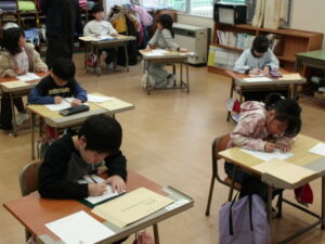 活動が始まると、子どもたちは今までの練習の成果を発揮しようと、お手本に目を落としながら一文字一文字に集中し、細部まで気を配りながら丁寧に書き上げていました。