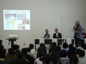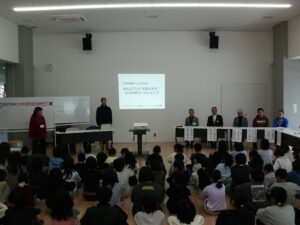 活動前半は地域団体による活動紹介でした。伊米ヶ崎地域からは、伊米ヶ崎共和国の森山さんが昨年伊米ヶ崎小学校の校地内で実施した「雪まつり」について発表しました。また、その他の地域からは、「国際雪合戦」や「結いの灯り雪洞まつり」などの活動の紹介があり、子どもたちは地域のさまざまな活動に興味をもちながら、真剣に話を聞いていました。