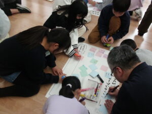 活動が始まると、子どもたちは一斉に自分のアイデアを付箋に書き出しました。「雪の中での宝探し」や「かまくら作り」、「雪の滑り台」「巨大雪だるま作り」「アイス食べ放題」等々、次々といろんなアイデアがとび出し、各グループの模造紙が、あっという間に付箋で埋め尽くされてしまいました。伊米小の子どもたちも、雪国ならではの楽しい活動を真剣に考え、進んでアイデアを付箋に書いていました。