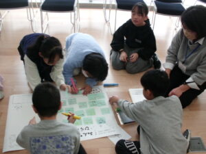 これは、魚沼市生涯学習課が企画した事業で、雪国のよさを活かした楽しい冬の過ごし方について、地域の大人と交流しながらアイデアを出し合うというものです。4年生の子どもたちは、いっしょに参加した小出小学校の4年生とも交流しながら楽しく活動に参加しました。