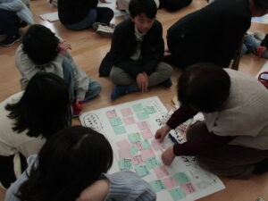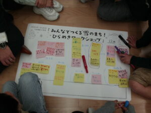 後半は、15のグループに分かれてワークショップを行いました。「雪国の良さを活かした楽しい冬の過ごし方」というテーマについて、地域の方々と子どもたちがいっしょになってアイデアを出し合いました。