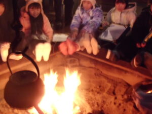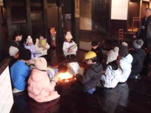子どもたちは、目黒邸の中にはいると、まずその広さに驚きました。そして、現代の家庭にはない、火が焚かれている大きな囲炉裏を囲みながら、施設の方から目黒邸の歴史について説明を受けました。