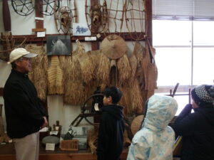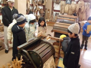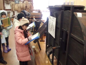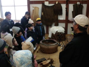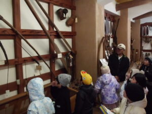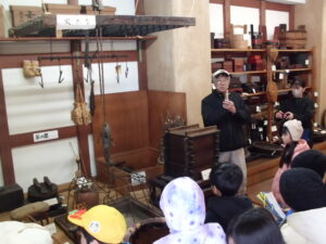 最後に民俗文化財館を見学しました。昔の道具がたくさん展示してありました。子どもたちは、昔の道具に興味を示し、進んで施設の方に質問したり、メモを取ったりしながら、むかしのくらしについて理解を深めていました。