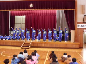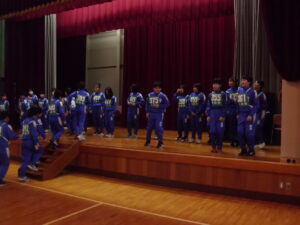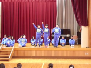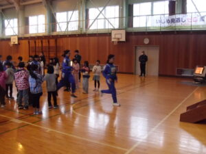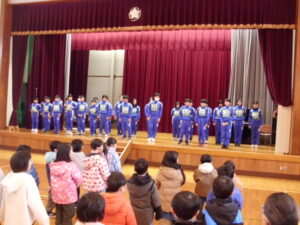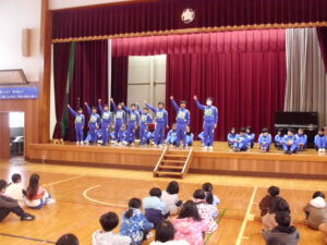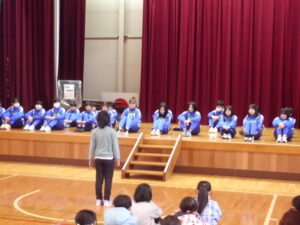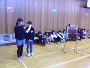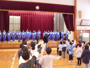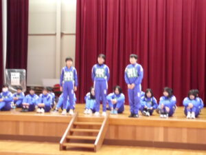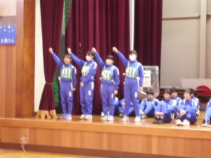 また、激励の応援では、寒い体育館ではありましたが、4年生のリードのもと、運動会の応援合戦の時のように、1年生から4年生が大きな声で応援し「かんばれ5・6年生!」の気持ちを表現しました。