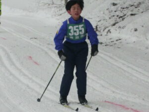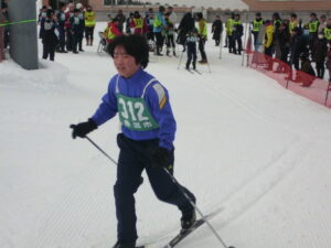 伊米ヶ崎小の5・6年生は、4年生もいっしょに「課外クロカン部」として週に2日程度、練習してきました。この日は、その練習の成果を発揮する場です。天気に恵まれ、風を切って斜面をすべる時は気持ちがよいのですが、折り返し地点の近くにくると、長い上り斜面が続き、息が切れます。しかし、選手たちは、へこたれませんでした。呼吸を整えながら、苦しさに耐えて斜面を登りきってターンをし、勢いよく斜面を下っていきました。