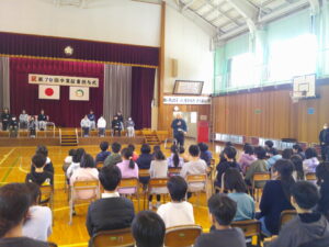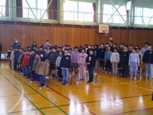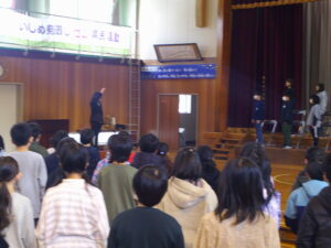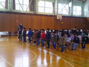 今日は、4時間目に卒業式の全校練習がありました。主な練習内容は、「礼法(おじぎ・姿勢)」「門出の言葉(全校のよびかけ)」「歌」の3つでした。