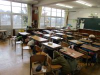 非常ベルが鳴って、地震発生の放送を聞いた子どもたちはすぐに机の下へと避難。