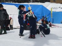 出発テントで緊張しながら自分の出番まで待つ緊張感を味わいながら、元気に滑り出していく小出小チームの子どもたち。