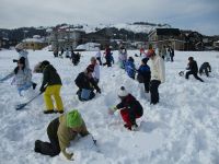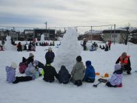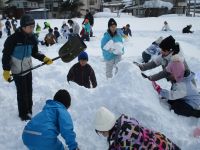 晴天のもと、サケラッコ班(縦割り班)でミニかまくらや雪像づくりに取り組みました。