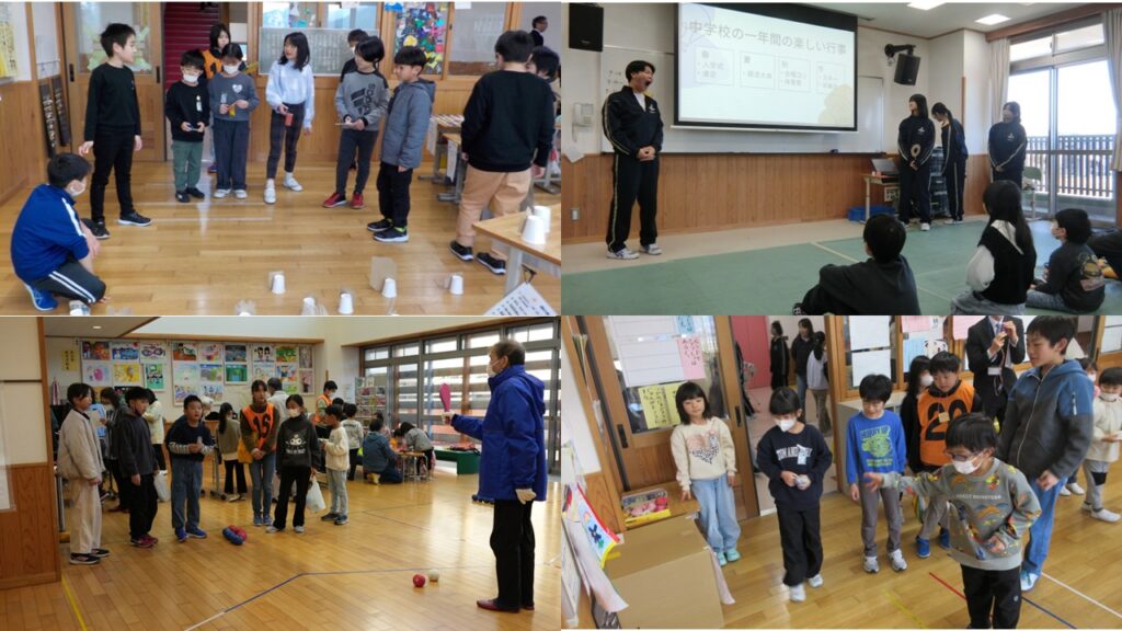 湯之谷中学校1年生のブースでは、中学校生活にまつわるクイズが出題され、正解数に応じて、的当てゲームの玉の数が決まるなど、中学校生活を楽しく知ることができました。また、湯之谷3地区コミュニティーの皆様からは、誰でも楽しく取り組めるスポーツ「ボッチャ」の体験コーナーや、あやとり・けん玉・めんこなどの昔ながらの遊びなどを教えていただきました。