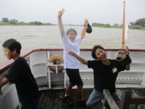 そして、信濃川ウォーターシャトルに乗り、信濃川下流域の川幅や水量の多さを間近で見てきました。ここでもまた驚きと大興奮の連続!学校のそばを流れている羽根川の水も最終的には、こんなに大きな川になっていることを体感した様子でした。