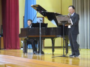 広神東小学校の校歌を作曲してくださった平井康三郎さんの孫である、平井裕也さんと裕也さんの母である平井彰子さんからご来校いただき、コンサートと歌唱指導をしていただきました。