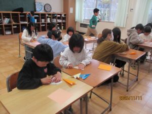 2025年11月13日 / 最終更新日時 : 2025年11月13日 higsh 日々だより 「若あゆグループ祭りにむけて」 11月21日に若あゆグループ祭りが行われます。若あゆグループごとに「紙飛行機飛ばし」「ボーリングゲーム」などの楽しい遊びを計画しています。先週から、祭りに向けた準備が始まりました。6年生が中心となり「紙飛行機を一人〇つ作ってね」「何日までにペットボトルを準備してね」等、下学年に声をかけています。当日はどんな祭りが出来上がるのでしょうか。楽しみです。 Follow me! FacebookXHatenaPocketCopy