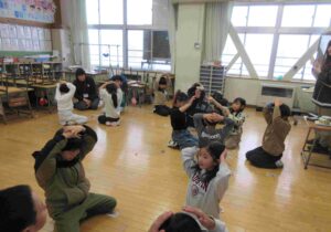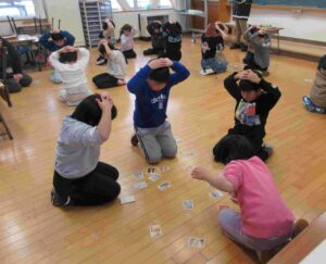 読み始めるまでは「手は頭の上」のルールで楽しく、かるたに親しんでいました。覚えていて、少し読み始めるとすぐにとっている人もいました。