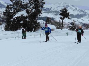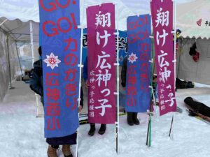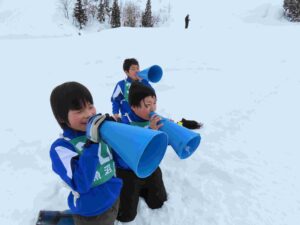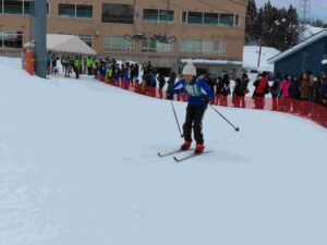これまでの大雪で、学校での練習も、スキー場での練習もいつも雪に降られていましたが、一転して太陽が顔を出していました。朝早くから保護者ボランティアの方々も応援に駆けつけてくださいました。