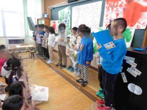 来年度入学する年長児と1年生・5年生との交流会が行われました。はじめに1年生が小学校の学校生活についての説明を行いました。1年生は、自分たちで描いた絵を見せながら大きな声で上手に発表することができました。そのあと、手作りのかわいいプレゼントを前に、年長児さんも緊張がほどけ、楽しい笑い声や元気な声で部屋がいっぱいになりました。次に、5年生が年長児さんをサポートしながら学校ウォークラリーをしていました。来年は6年生として1年生のサポートをがんばりたいという気持ちで、1年生の様子をよく見ながら過ごしていました。