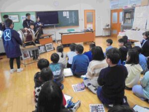 須門神社太々御神楽幹事の仲丸貴継様はじめ3名の皆様を招き、3・4年生が太々御神楽や須門神社についてお話を聞かせていただいたり、神楽の舞や使う道具、衣装などを見せていただきました。さらに、稚児舞の練習に参加している3年生と4年生の児童から、笛などを演奏してもらったりお話を朗読してもらったりしました。