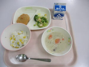 本日の給食は、コーンライス、豆乳クリームシチュー、カボチャコロッケ、豆サラダ、牛乳です。今日の本とのコラボ給食のメニューは、「14ひきのかぼちゃ」という絵本より、かぼちゃコロッケ、「ジャックと豆の木」より豆サラダ、「ルドルフとイッパイアッテナ」という本より豆乳クリームシチューです。ルドルフとイッパイアッテナという物語は、飼い猫だったルドルフが、魚屋から逃げて、うっかり知らない大都市に運ばれてしまうところから始まります。そこで現地の野良猫の親分と出会い、文字や知恵の大切さを教わりながら、野良猫としての生き方を教わっていく物語です。