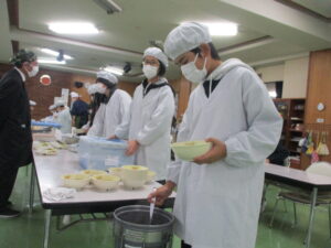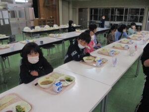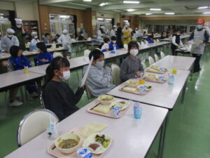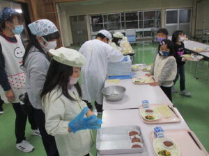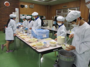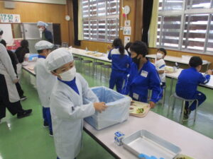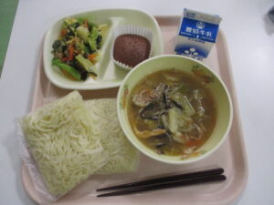 本日の給食は、中華麺、味噌ラーメンスープ、海藻サラダ、チョコ風味米粉蒸しパン、牛乳です。今日のみそラーメンは、リクエスト給食主食部門の第4位、海藻サラダは野菜のおかず部門で第4位にランクインしたメニューです。そして、チョコ風味米粉蒸しパンは、「チョコレート工場の秘密」に登場するメニューです。チョコレートにちなんで、いつもよりもチョコチップを増やしました。