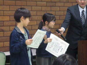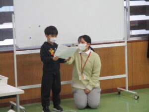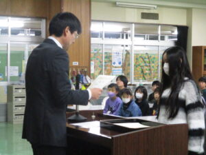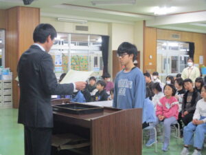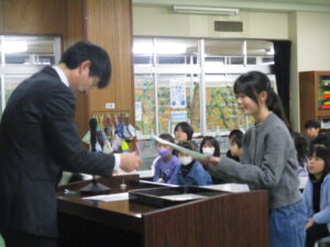気温が低いので、食堂で行いました。本日は3種類の表彰でした。また、先日の全校集会時に1年生が学級閉鎖であったため、給食時に発表をしてもらいました。
