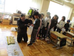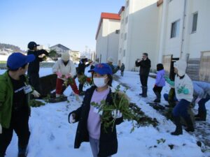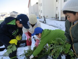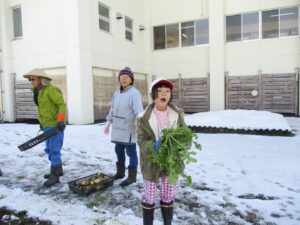 畑の先生に教わりながら育ててきた大根を本日収穫しました。雪の下の大根を抜いて、水で洗ってと寒さに負けずに頑張りました。家に持ち帰りたい!、大根パーティーがしたい!、給食でみんなに食べてもらいたい!と様々な思いが膨らんでいる2年生です。畑の先生を引き受けてくださった皆様、ありがとうございました!
