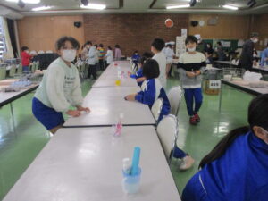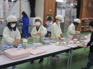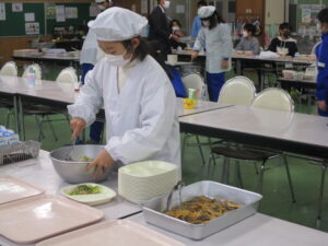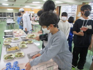 本日の給食は、ごはん、豚汁、さばの味噌煮、ゆかり和え、牛乳です。ゆかり和えは、リクエスト給食の野菜のおかず部門で第5位、豚汁は、お汁部門で第4位に入ったメニューです。今日の給食にも使われているキャベツ・大根・長ネギは、ものずき村さんから届きました。ものずき村さんの営業は、雪が降るため、11月で終わります。残りわずかになりましたが、地域で育てられたおいしい野菜を味わってほしいと思います。