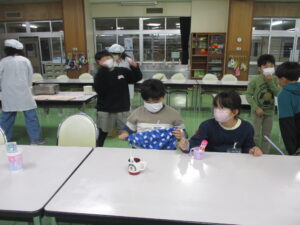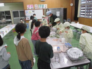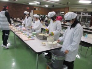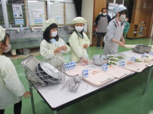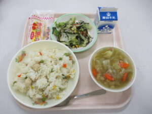 本日の給食は、チキンピラフ、ABCスープ、ひじきサラダ、イチゴクレープ、牛乳です。今日で11月の給食も終わりです。今日のいちごクレープは、リクエスト給食のデザート部門で第3位に入ったメニューです。ほかにも、みなさんの好きなメニューが並びました。さて、今月は食欲の秋ということで、たくさんの人気メニューを給食に登場させました。楽しんでいただけたでしょうか?12月の給食もお楽しみに!