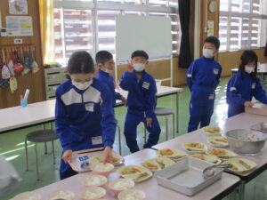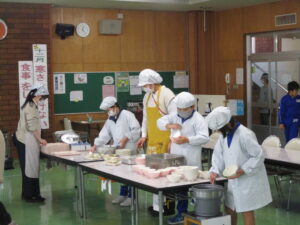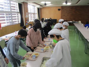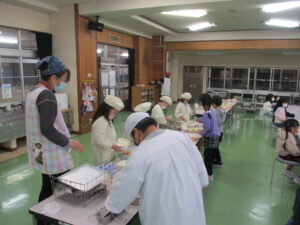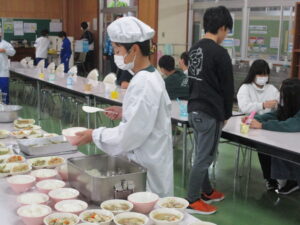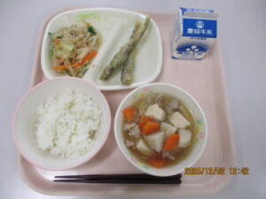 本日の給食は、ごはん、芋煮汁、子持ちししゃもの磯部天ぷら、たくあん和え、牛乳です。12月の食育のめあては「寒さに負けない食事をしよう」です。寒くて水も冷たくなってきていますが、インフルエンザやノロウイルスなどの感染症も流行しています。食事の前や帰宅後、トイレ後などの手洗いを徹底しましょう。今日の芋煮汁は旬の里芋を生かした山形県の郷土料理です。
