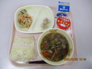 本日の給食は、中華麺、五目旨煮めんスープ、肉シュウマイ、もやしの華風サラダ、牛乳、ヨーグルトです。五目旨煮めんは、たくさんの種類の食材を使い、しょうゆベースの味付けで、オイスターソースが入っているのがポイントです。お店の味にどのくらい近付けたでしょうか?いかやたけのこ、きくらげなど、かみ応えのある食材を多く使っています。食感も一緒に楽しみましょう。