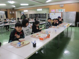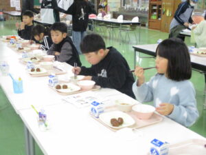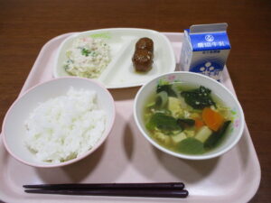 本日の給食は、ごはん、中華たまごスープ、肉団子甘酢あん、味噌ポテトサラダ、牛乳です。冬は寒いせいか、冷たい牛乳の残りが増えます。いつもは2~3本なのが、11月後半からは5~6本くらい残ります。給食では、パンの日だけでなく、ごはんや麺の日も牛乳がつきます。それは、カルシウムがどうしても足りないからです。牛乳ほど効率よくカルシウムがとれる食材はありません。寒いですが、成長期のみなさんにはとても大事な栄養素なので、少しでも飲んでくれるとうれしいです。