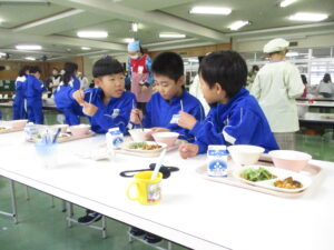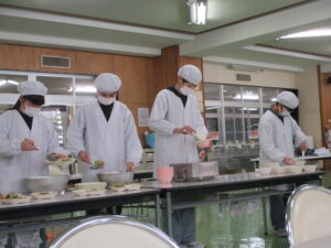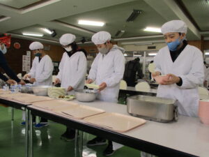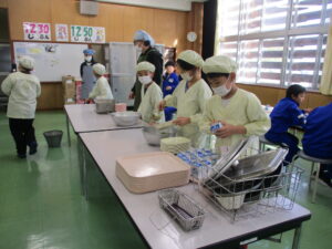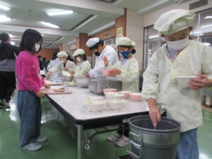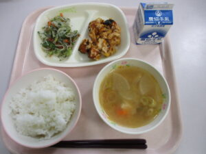 本日の給食は、ごはん、あさりのみそ汁、かぼちゃとちくわのそぼろ煮、かおり和え、牛乳です。今日のイチオシは、主菜のかぼちゃとちくわのそぼろ煮です。かぼちゃとちくわは食べやすい大きさに切り、油で揚げます。そして鶏ひき肉を炒めて作ったそぼろあんと絡めて完成です。そぼろあんに、しょうがを加えることで、さわやかさが加わり、最後までおいしく食べられます。ごはんと一緒に食べてほしい一品です。
