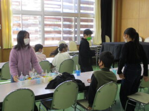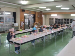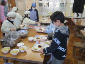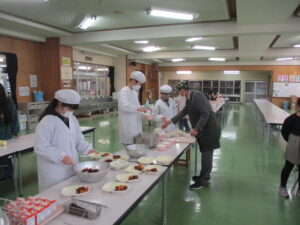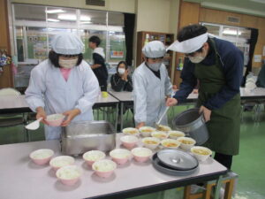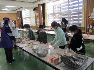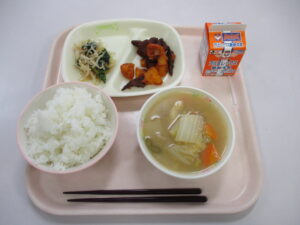 本日の給食は、ごはん、冬野菜のみそ汁、レバーとポテトのケチャップ和え、しょうゆフレンチ、牛乳です。給食で使っているレバーは、豚レバーです。下味が付いているものを揚げてから、ケチャップソースと混ぜ合わせています。ケチャップソースには、レモン果汁を入れているのがポイントです。ごはんにも合う味付けとなっているので、よく噛んで食ベてほしいおかずです。
