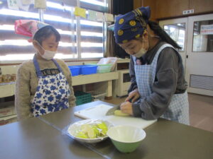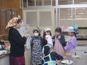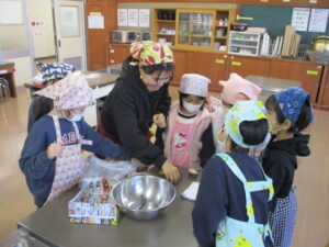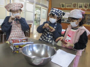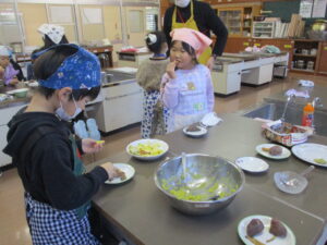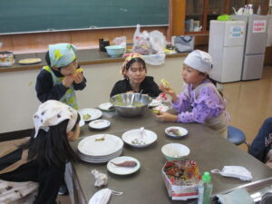 今日も、さつまいもの先生に来ていただき、さつまいもクレープづくりに挑戦した1年生です。慎重に包丁を使って果物を切ったり、手でさつまいもの皮をむいたりと、説明をしっかりと聞いて取り組んでいました。自分たちで作ったさつまいもでのクレープはおいしかったようです!