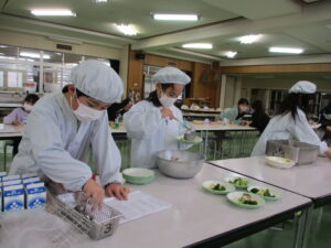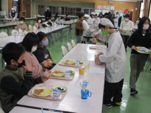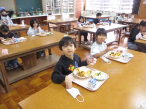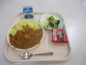 本日の給食は、豆乳仕立てのバターチキンカレー、花野菜サラダ、セレクトデザート、牛乳です。今日はクリスマスイブの前日です。そして2学期の給食最終日です。バターチキンカレーは、いつもよりも豆乳とバターをたっぷり使い、カレー粉も追加して、ピリ辛でありつつまろやかな味を目指しました。そして、花野菜のブロッコリーとカリフラワーは、ツリーの木をイメージして、デザートにはみなさんが自分で選んだクリスマスケーキを添えました。3学期も元気な皆さんと会えることを楽しみにしています。