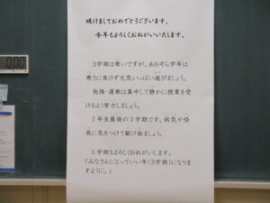 2026年1月13日 / 最終更新日時 : 2026年1月13日 suhsh 全校 朝の黒板メッセージ 今日から3学期スタートです!各教室には、担任からのメッセージがありました。 Follow me! FacebookXBlueskyHatenaPocketCopy コメントを残す コメントをキャンセルメールアドレスが公開されることはありません。 ※ が付いている欄は必須項目ですコメント ※ 名前 ※ メール ※ サイト Δ