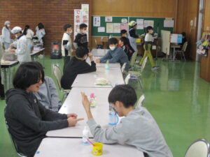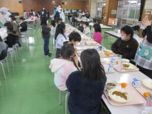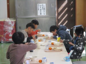 本日の給食は、冬野菜カレー、みゆきもちのぜんざい、牛乳、みかんです。明けましておめでとうございます。今日から3学期がスタートです。寒い冬こそ、しっかり食べて元気な身体を作っていきたいものです。さて、今日は、須原小学校の近くにある「あぶるま食品さん」のおもちを使った「ぜんざい」です。魚沼産のお米を使って、毎日おもちをついているので、お米のおいしさを味わえる、本物のおもちです。のどにつまらせないように、一口を小さくして、よくかんで食べていました。また、今日から向き合っての給食をスタートしました。仲間との会話も楽しみながら給食を食べてほしいです。