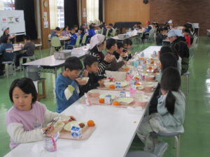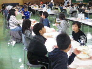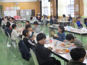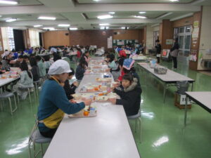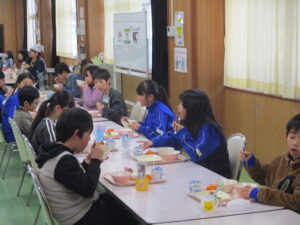 本日の給食は、ごはん、豚汁、からあげ、ゆかり和え、みかん、牛乳です。今日の献立は、須原小学校の6年生が立てた献立です。栄養バランスだけでなく、旬やいろどり、調理法など様々なポイントを考えて立ててくれました。旬の食べ物は、キャベツや大根、みかんなどです。ぜひ感想を6年生に伝えてあげてください。