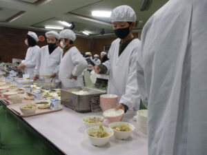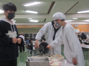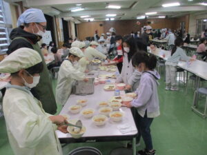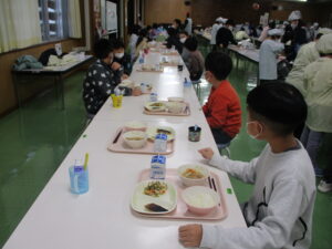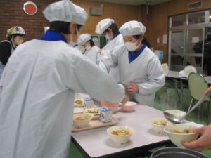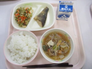 本日の給食は、ごはん、キムチなべ、ほっけの香味焼き、煮菜、牛乳です。煮菜とは、塩漬けした菜っ葉を煮た料理のことをいい、新潟県の郷土料理です。冬の始まりに収穫された菜っ葉を塩漬けにすることで、長い期間保存することができます。野菜のとれない冬の間も食べられるようにした先人に知恵がつまった料理です。打ち豆の食感と一緒に味わってほしいです。