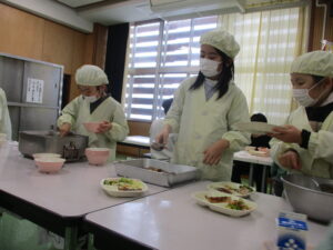 本日の給食は、ごはん、白菜のみそ汁、さばのごまソース、れんこんの梅肉和え、牛乳です。大口れんこんは、長岡でとれるブランドのれんこんです。断面の色がきれいなことと、シャキシャキとした食感が特徴のれんこんです。梅干しのさっぱりした味がよく合う一品です。脂ののった「さば」を食べた後に、副菜でさっぱりできるような料理を組み合わせました。