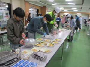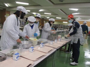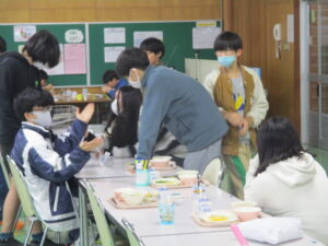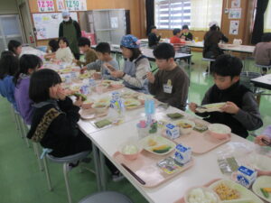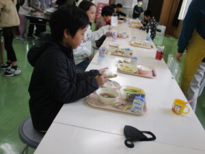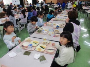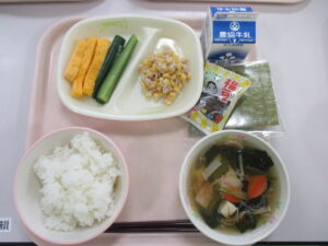 本日の給食は、酢飯、すまし汁、手巻きのり、卵焼き、きゅうり、ツナマヨサラダ、黒糖大豆、牛乳です。今日は節分献立です。節分とは、季節を分けると書きますが、暦の上では、節分をすぎると春となります。節分では豆をまくときに、「鬼は外、福は内」と言いますが、これは、幸せがたくさん訪れますようにという願いが込められています。今日の給食は、恵方巻にちなんだ手巻き寿司、すまし汁には鬼の形のかまぼこ、デザートには黒糖味の大豆をつけました。幸せがたくさん入ってきますように…という思いをこめながら食べてほしいです。
