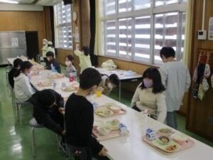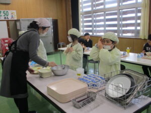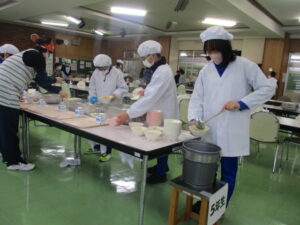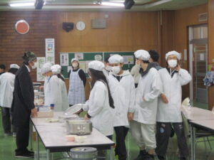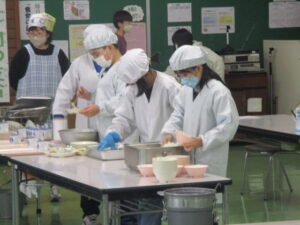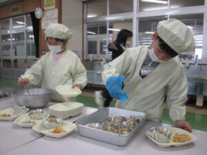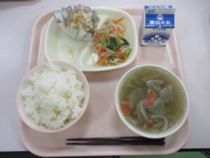 本日の給食は、ごはん、塩とり汁、れんこん入り手作りジャンボ焼売、もやしナムル、牛乳です。今日のメニューはすべて、中学校3年生のリクエストメニューです。その中でも「塩とり汁」は隠れた人気メニューです。材料はシンプルですが、鶏肉から出るうま味とごぼうの深みがポイントです。ジャンボ焼売は、調理員さんお手製です。